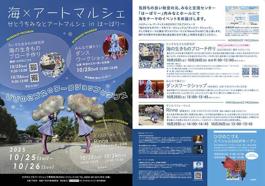 本イベントは、NHK Eテレ『にほんごであそぼ』の衣装・セットを担当し、今治タオルのデザインも手掛けるコスチューム・アーティストのひびのこづえさんプロデュースにより、「海の生きものブローチ作りワークショップ」「ダンスワークショップ」、そして海をテーマに踊る「ダンスパフォーマンス“Rinne(りんね)”」が上演されます。